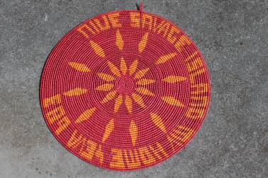 In her latest series Tala o le tau: Stories from the weather (2025), Kihara has worked collaboratively with the Moata’a Aualuma Community of Upolu Island, Sāmoa, in the creation of vibrantly coloured fala su’i (embroidered mats). Each mat, woven from pandanus fibre and bright woollen thread, renders the infrared satellite imagery of tropical cyclones which have impacted the Sāmoan archipelago over the past two decades.